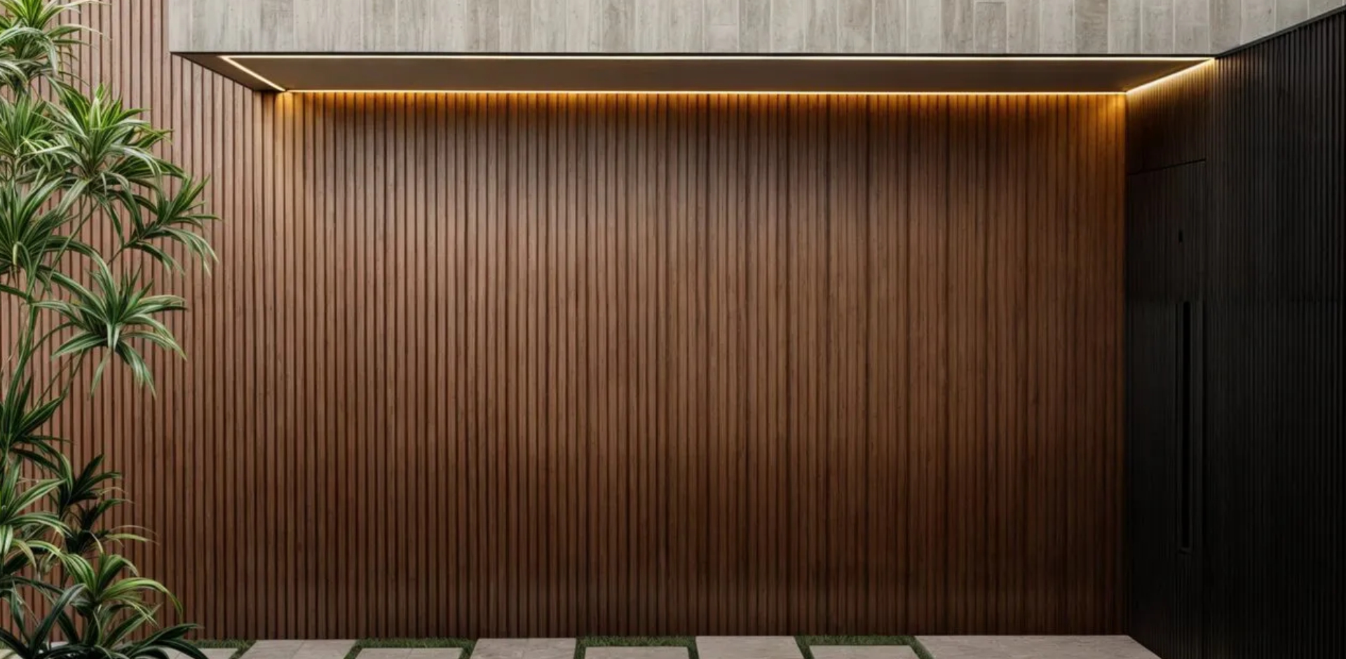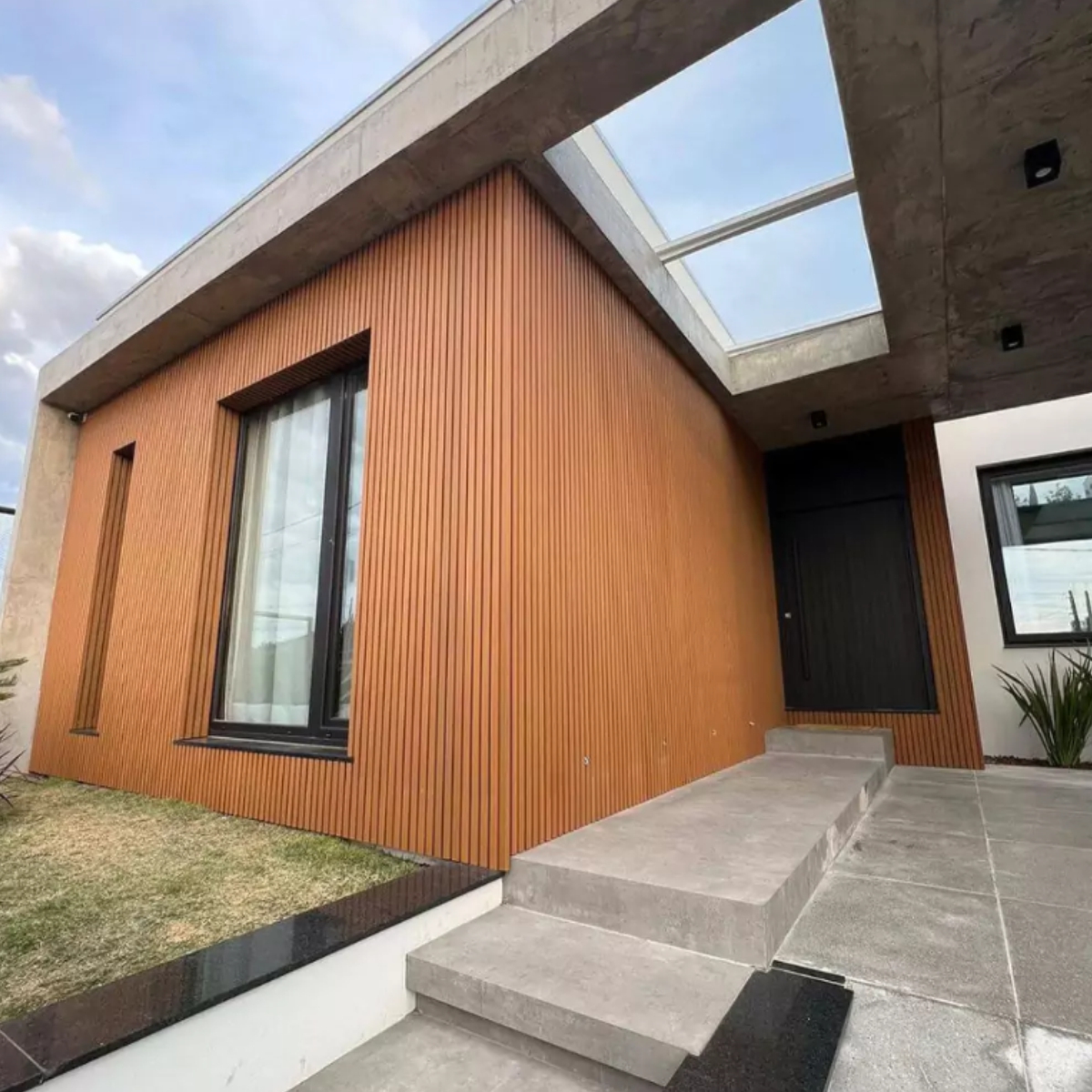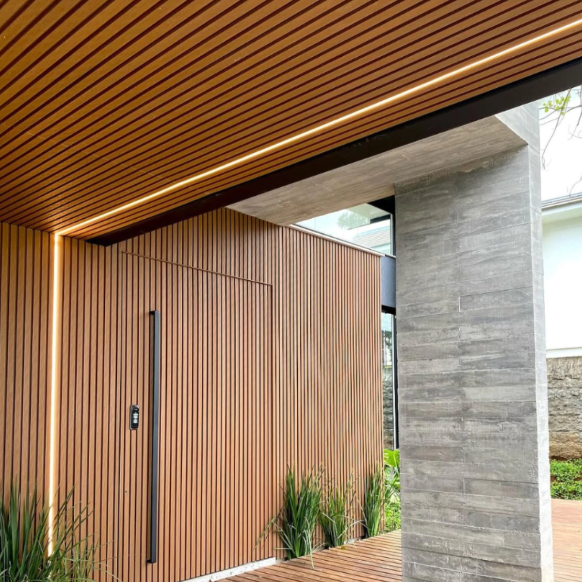 Produced for outdoor areas, Ecological Wood Slats combine the beauty of wood with the durability of WPC, bringing grooves and tones very similar to natural wood.